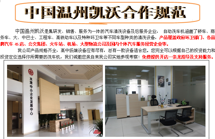 瑞安凱沃公司洗車設(shè)備從研發(fā)到生產(chǎn),直接到客戶手中,沒(méi)有中間商環(huán)節(jié),價(jià)格更加實(shí)惠,還會(huì)得到更好的保修服務(wù)。 我們首家推出:買洗車設(shè)備就可獲得從籌備到開(kāi)業(yè)的全方位支持。不僅省心省力,同等規(guī)模的經(jīng)營(yíng)項(xiàng)目更比加盟別人品牌節(jié)約投資30%以上,因?yàn)槲覀冊(cè)O(shè)備都是廠家直銷價(jià),還可以從我們這里得到經(jīng)營(yíng)、管理、培訓(xùn)、原料配給、技術(shù)支持等全方位的免費(fèi)增值服務(wù);更沒(méi)有所謂的加盟費(fèi)、保證金和品牌使用費(fèi)。市面上也有一些加盟企業(yè)對(duì)外宣稱免收加盟金、保證金和品牌使用費(fèi),卻變相的把產(chǎn)品價(jià)格翻了幾倍,照樣賺翻加盟商的錢,最后發(fā)覺(jué)上當(dāng)受騙還得不到什么實(shí)際的支持,任加盟商在大浪淘沙般的市場(chǎng)中自生自滅。