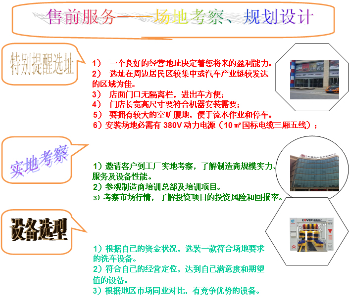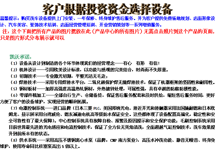 我公司產(chǎn)品規(guī)格齊全,高中低端設(shè)備應(yīng)有盡有,總有一-款設(shè)備適合您免費(fèi)費(fèi)提供開(kāi)店一 條龍指導(dǎo)及支持服務(wù)。投資定位選擇你所需需要的洗車機(jī)。我們誠(chéng)邀您親自來(lái)我公司實(shí)地參觀考察!