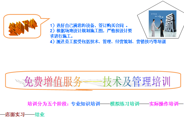 我公司為客商提供支持具體如:選址、管理、技術(shù)、培訓(xùn)、信息、經(jīng)營(yíng)策劃、配送、 服務(wù)等共八項(xiàng)支持: